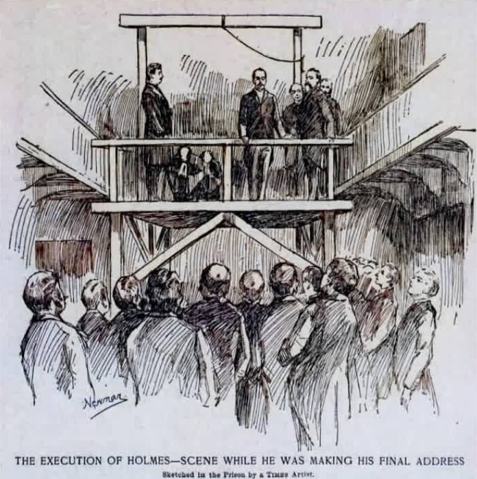 Amikor a csapóajtó kinyílt, a kötél nem törte el a nyakcsigolyáit, ahogy kellett volna. Holmes lassan megfojtva, rángatózva és levegőért kapkodva halt meg több mint tizenöt perc alatt. Kivégzése nem hozta meg azt az igazságérzetet, amelyben az áldozatok családjai reménykedtek – a folyamat éppoly elhúzódó és fájdalmas volt, mint sok áldozatáé. Bizarr módon a hosszú fulladás valamiképpen találó volt egy olyan férfira, aki annyi lassú, fullasztó halált tervezett meg mások számára.[1][2]